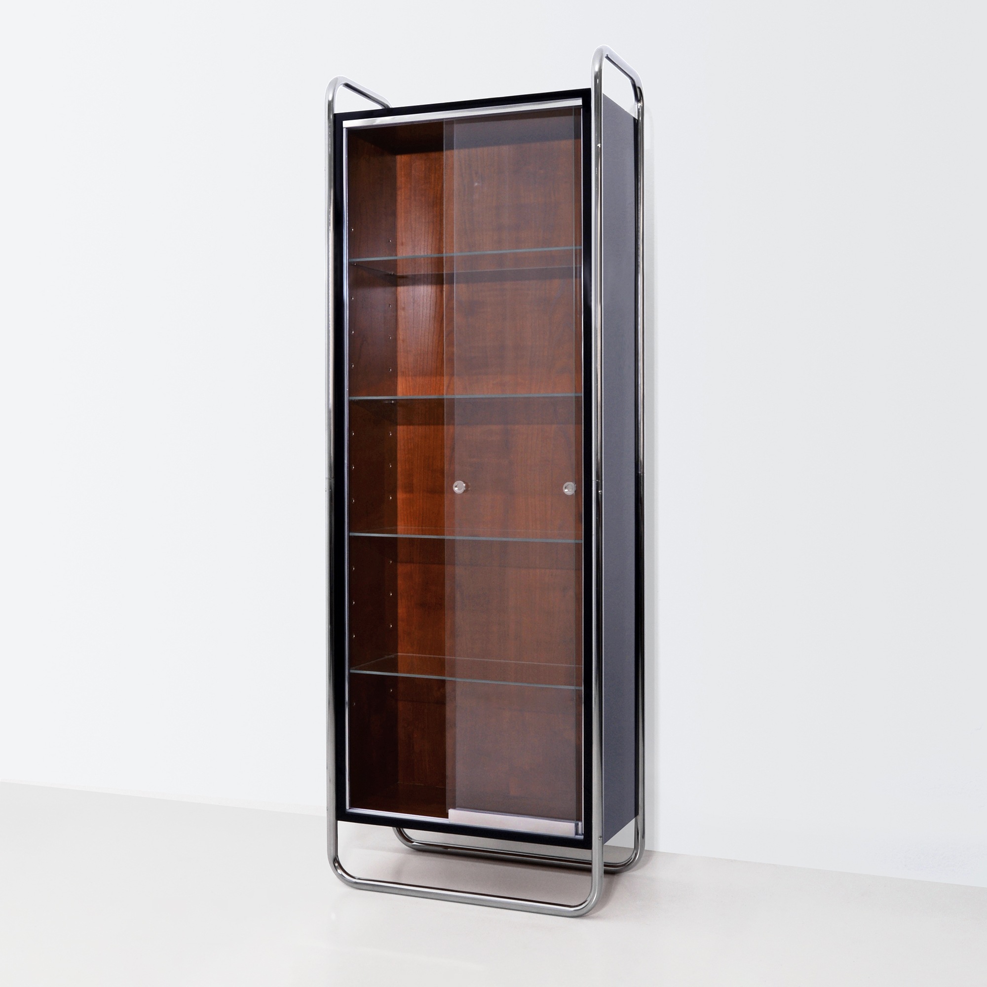 verchromtes Stahlrohr, Kirschbaumfurnier, lackierte Tischlerplatte,