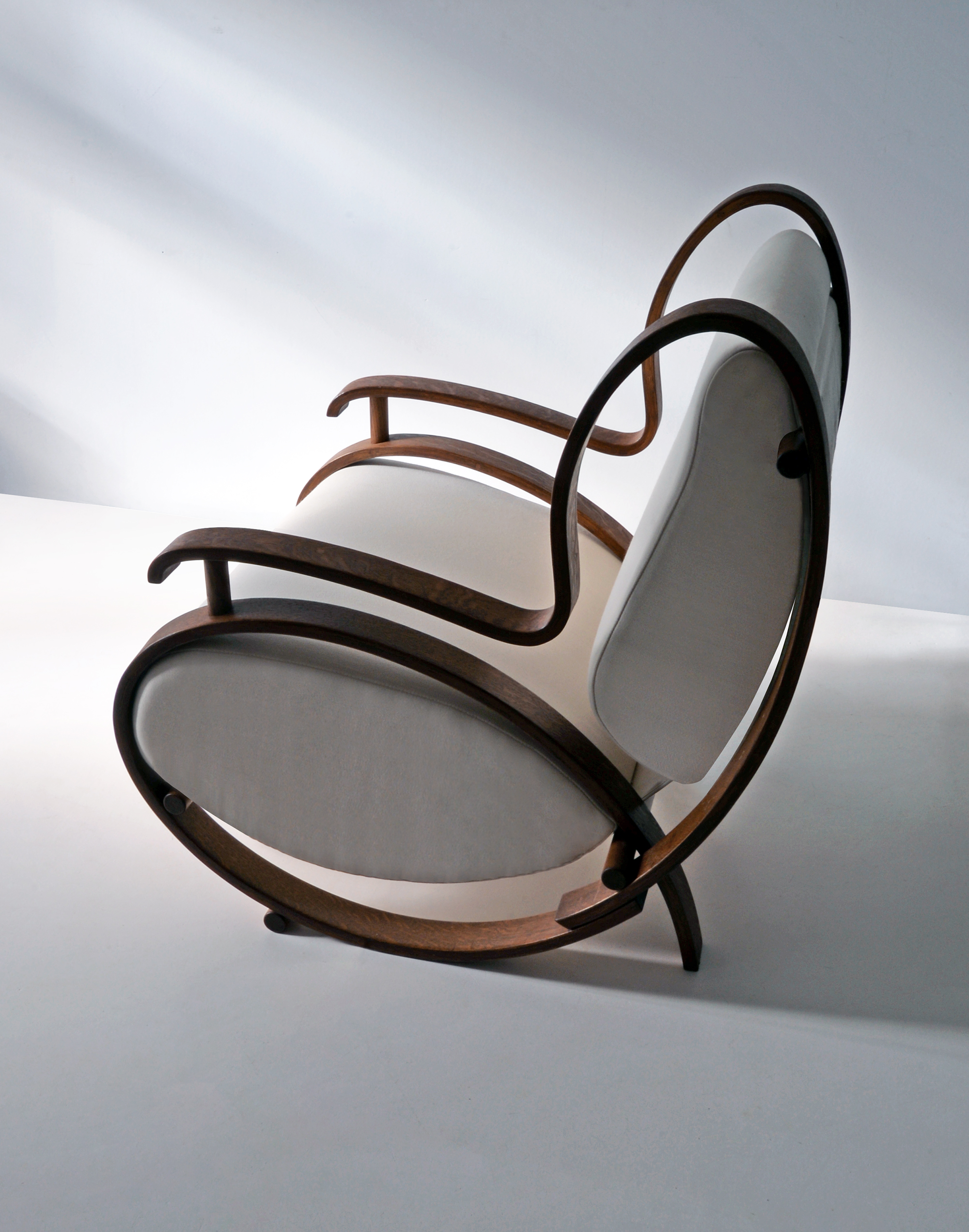 Stained bentwood, fabric upholstery.